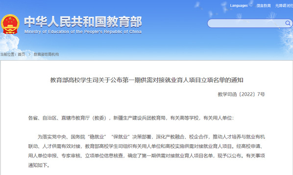 教育部第一期供需对接就业育人项目球探网页版立项名单