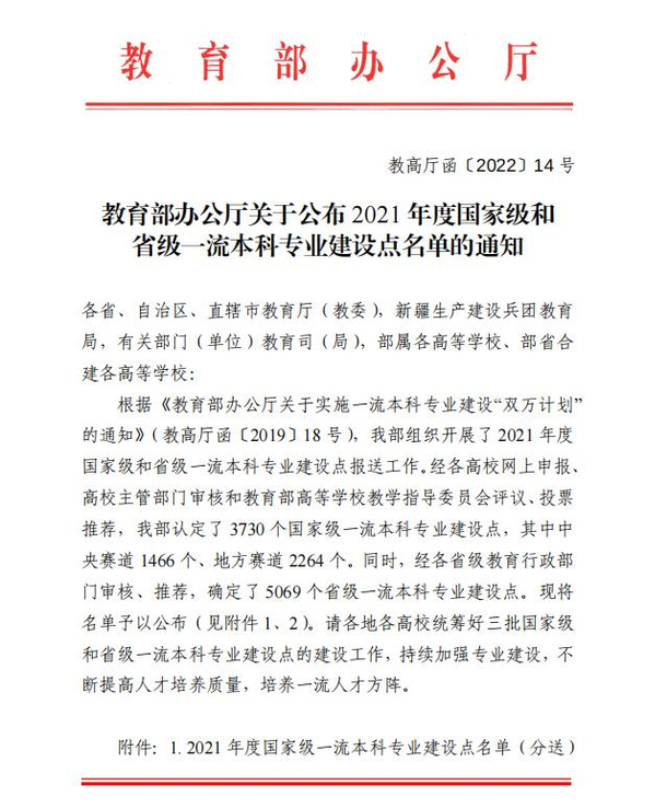 近日,教育部办公厅公布了《关于2021年度国家级和省级一流本科专业建设点名单的通知》(教高厅函〔2022〕14号),球探qiutan(中国)官方计算机科学与技术专业入选省级一流本科专业建设点。至此球探qiutan(中国)官方共有电子信息工程、英语和计算机科学与技术专业等三个专业获批省一流专业建设点。