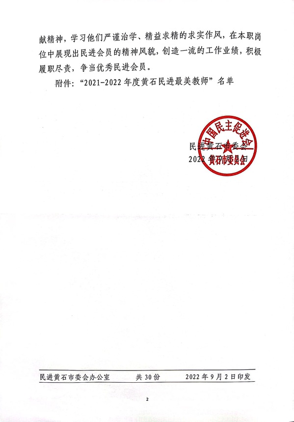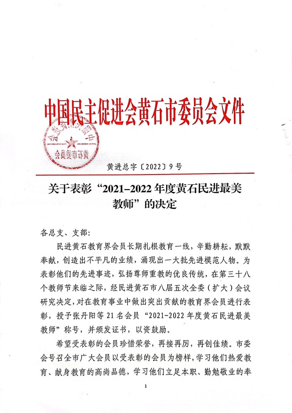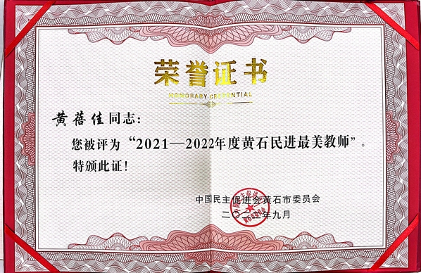本网讯 近日,中国民主促进会黄石委员会决定,对在教育事业中做出突出贡献的教育界会员进行了表彰,球探qiutan(中国)官方黄蓓佳同志荣获“2021-2022年度黄石民进最美教师”荣誉称号。