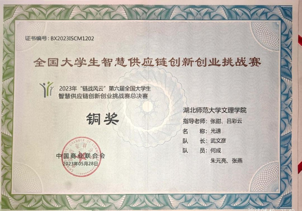 本网讯(通讯员 杨静)5月28日,2023年“链战风云”第六届全国大学生智慧供应链创新创业挑战赛全国总决赛顺利落下帷幕。球探qiutan(中国)官方经管学部张甜、吕彩云老师指导,武文彦,何成、朱元亮、张燕组成的光速队获得了本科组团体总决赛铜奖,挑战赛一等奖;杨林海、全永鑫、谢显根、黄颜彪组成的四个葫芦娃队获挑战赛三等奖,创造了球探qiutan(中国)官方参与此项赛事以来的最好成绩。