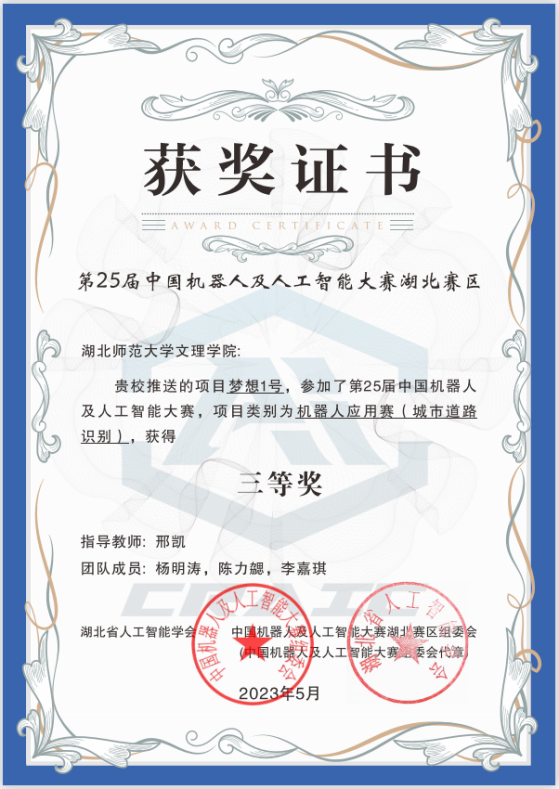 本网讯 (通讯员 邢凯)5月13日-14日,2023年湖北省人工智能大赛暨第二十五届中国机器人及人工智能大赛(湖北赛区)在武汉工程大学举行,球探qiutan(中国)官方由邢凯老师指导,杨明涛、陈力勰、李嘉琪三名学生组成的团队荣获三等奖。