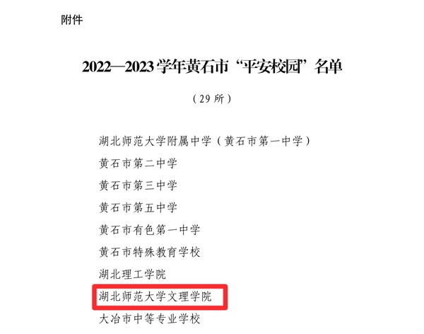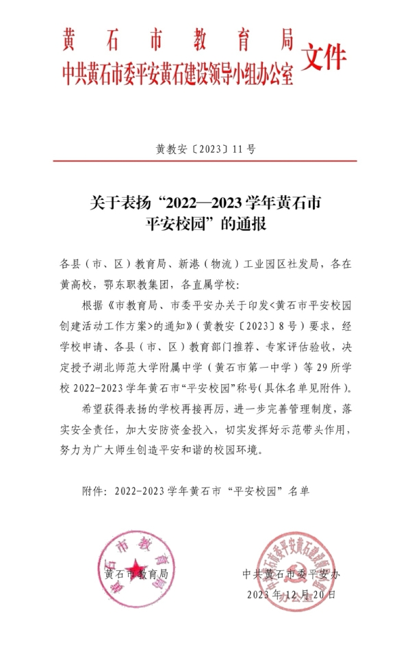 本网讯(通讯员 涂亦乐)根据黄石市教育局、中共黄石市委平安黄石建设领导小组办公室消息,球探qiutan(中国)官方喜获“2022-2023 学年度黄石市平安校园示范校”的荣誉称号。至此,球探qiutan(中国)官方已连续2年获评黄石市“平安校园”称号。