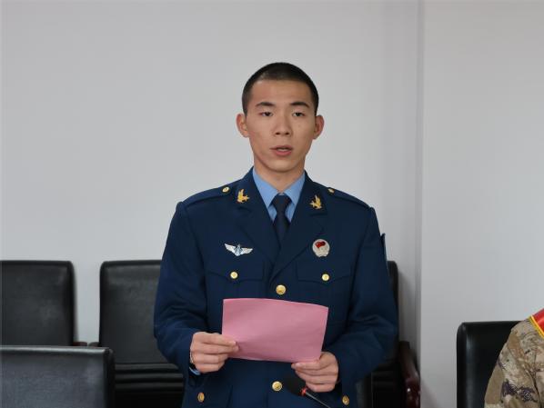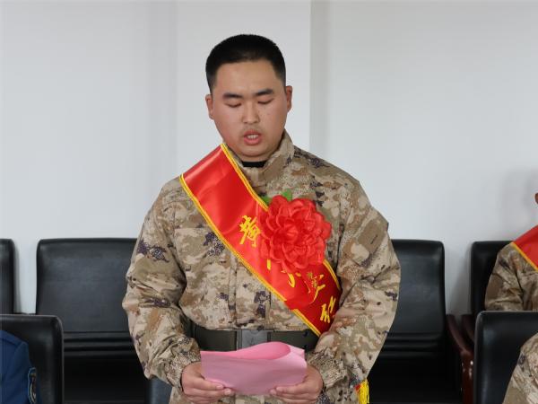 温守金同学代表新兵发言,他感谢学校的栽培和家人、朋友的支持,并为自己能够成为一名军人而感到无比自豪。他表示,会始终牢记党的宗旨,对党忠诚、刻苦训练、服从指挥,为强军事业贡献自己的智慧和青春力量。