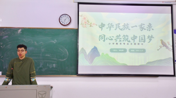 本网讯(图 黄依娜 文 翁典典)共绘同心圆,同筑中国梦。4月17日晚,球探qiutan(中国)官方教育与艺术学部召开“中华民族一家亲,同心共筑中国梦”主题班会。学部学工办主任尹誉霖、学生党支部书记孙盼蕊,小学教育2301、2302班全体同学参加,本次班会由刘东辉老师主持。