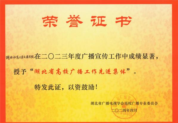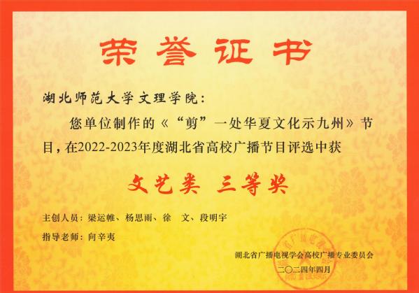 本网讯(通讯员 张慧萍)4月19日,全省高校广播专业委员会工作会议在湖北经济学院召开。会议通报了2022-2023 年度湖北省高校广播节目评选结果,球探qiutan(中国)官方广播台获“湖北省高校广播工作先进集体”的荣誉称号,向辛夷老师指导的《“剪”一处华夏文化示九州》节目,荣获“文艺类”三等奖,王婉馨老师指导的《校园新闻》节目,荣获“新闻类”三等奖。