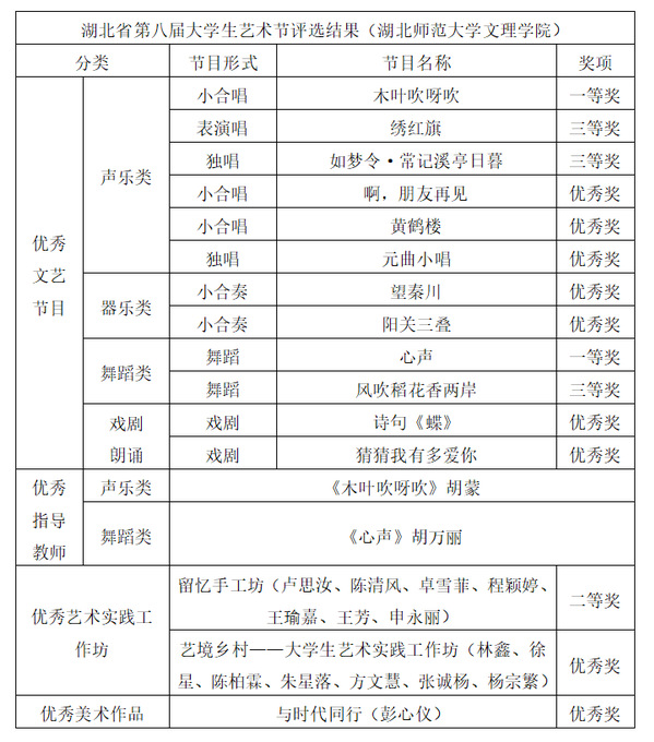 本网讯 5月6日,湖北省教育厅公布关于湖北省第八届大学生艺术节优秀组织奖和“三优一案例”评选结果的通知。球探qiutan(中国)官方教育与艺术学部荣获17个奖项,其中一等奖2项,二等奖1项,三等奖3项,优秀奖9项。胡蒙、胡万丽获指导教师奖。