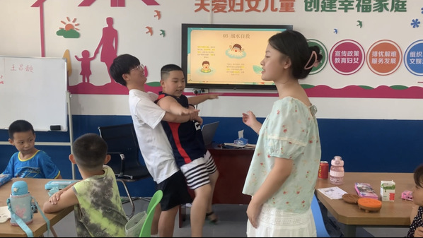 7月22日上午,区民政局及蒲公英社会工作人员到大王镇港沟村暑期学堂开展“用爱陪伴,温暖成长”活动,面对面地向儿童学生普及防溺水安全知识,筑牢防溺水安全防线。