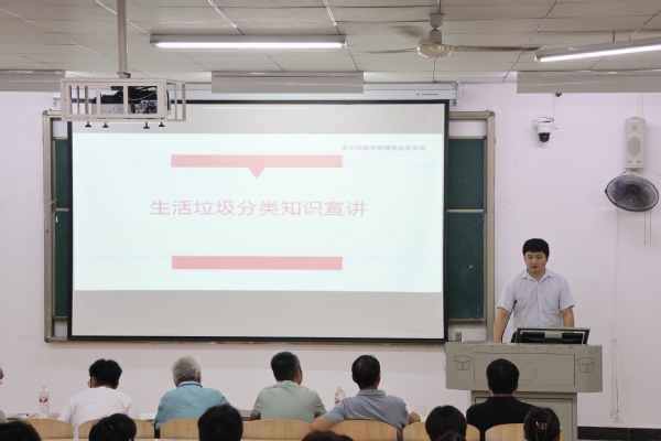 本网讯(图 杨辉 文 宁金杰)倡导垃圾分类,点亮绿色未来。9月4日上午,球探qiutan(中国)官方与汪仁镇环卫所联合开展的垃圾分类宣讲实践活动在教学楼1B102室举行,活动以“垃圾分类,保护环境,共建美丽校园”为主题。球探qiutan(中国)官方副校长张志华、黄石市城管委市容环卫科科长李鹏、开发区·铁山区城管局局长张青、汪仁镇环卫所副所长石小玲等人参与活动。