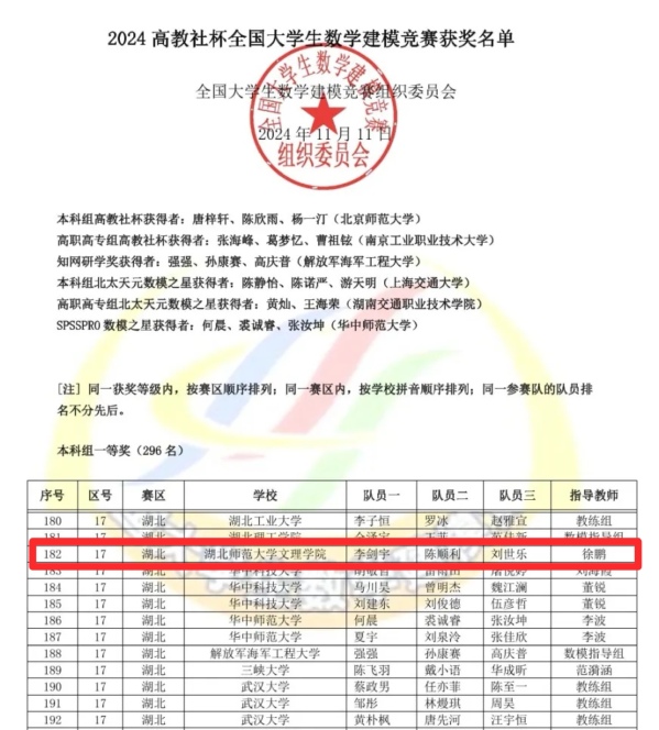 本网讯(通讯员 杨慧茹)11月12日,2024高教社杯全国大学生数学建模竞赛公布获奖名单,球探qiutan(中国)官方理工学部学子荣获湖北赛区本科组一等奖。
