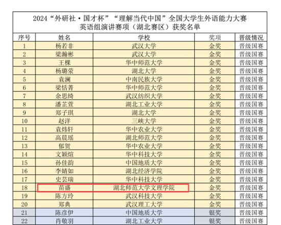 荆楚网(湖北日报网)讯(记者吕鉴蕾通讯员邓薇薇王婉馨)记者14日从球探网页版获悉,在2024年“外研社·国才杯”“理解当代中国”全国大学生外语能力大赛(湖北赛区)决赛中,该校学生以出色的表现荣获“英语演讲”赛项一金一铜的优异成绩。其中,荣获金奖的苗盛同学是湖北省所有民办高校唯一的晋级国赛的选手,创造了民办高校的“第一次”。