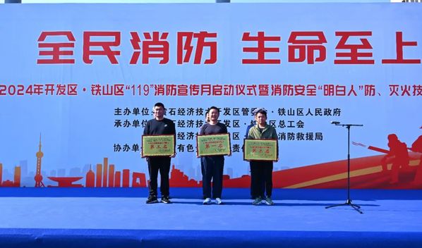 周晓达宣布2024年度开发区·铁山区“11·9”消防宣传月启动。本次竞赛活动包括了消防知识答题、100米疏散、3×50米接力灭火、快速出水控火4个科目,共组织60名消防安全“明白人”同台竞技。比赛中,参赛队员们动作娴熟、配合默契,斗志高昂、沉着冷静,严格按照操作规程进行比赛,争分夺秒地完成每一个消防技能动作。经过紧张激烈的比拼,决出团体和个人前三名名次,区总工会、区消防救援局相关领导为获奖团体、个人颁发奖牌和证书。