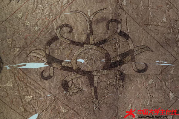 在荆州,队员们在博物馆寻“龙”找“凤”,蟠龙飞凤纹绣浅黄绢面衾、对凤对龙纹绣浅黄绢面衾、龙凤虎纹绣罗单衣袖、一凤二龙相蟠纹绣浅黄绢面禅衣、凤鸟花卉纹绣浅黄绢面绵袍,马山一号楚墓出土的丝织珍品,借龙与凤诉说着汉绣千年起源,以布局设计和设色水平,展示着古代劳动人民的智慧。绢地龙凤相蟠纹绣,以蟠曲的龙身与凤冠交叠成菱形骨架,金线与朱砂在素绢上勾勒出流动的韵律,让成员们直观感受到《尚书》中“衣画而裳绣”服饰文化。
