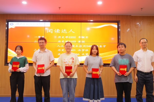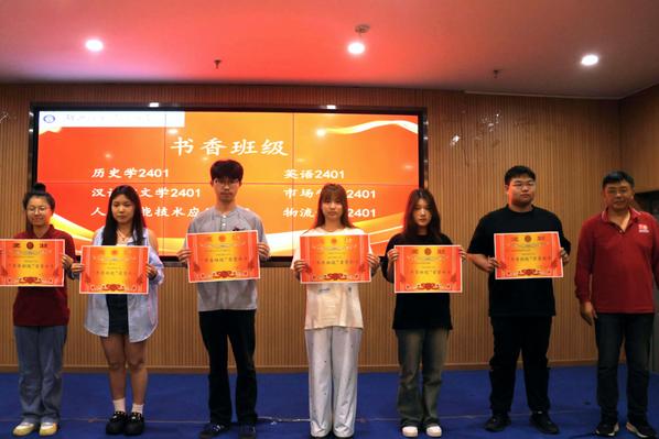 闭幕式表彰了本届读书月各项优胜单位和个人,人文学部荣获“书香学部”,历史学2401班、英语2401班、汉语言文学2401班、人工智能技术应用2402班、市场营销2401班和物流管理2401班荣获“书香班级”,李敏芳等10位同学荣获“阅读达人”荣誉称号,张力等7位同学分别荣获“科技与人文:经典作品中的未来想象”征文比赛一二三等奖,吴超然等10位同学分别荣获“码上寻书”比赛一二三等奖。