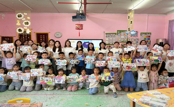 实践环节中,学生代表精心设计了互动教学方案。通过卡通图片展示、玩偶情景剧表演和洗手歌教学等形式,生动形象地向小朋友们讲解了手足口病、水痘等常见儿童传染病的传播途径与预防知识。现场小朋友兴奋地说:“姐姐演的小病毒太有趣了!我现在知道打喷嚏要捂住嘴巴啦!”在随后的趣味手工活动中,学生带领孩子们用画笔画下属于自己的“健康小卫士”。活动现场充满欢声笑语,孩子们在游戏互动中掌握了健康知识。