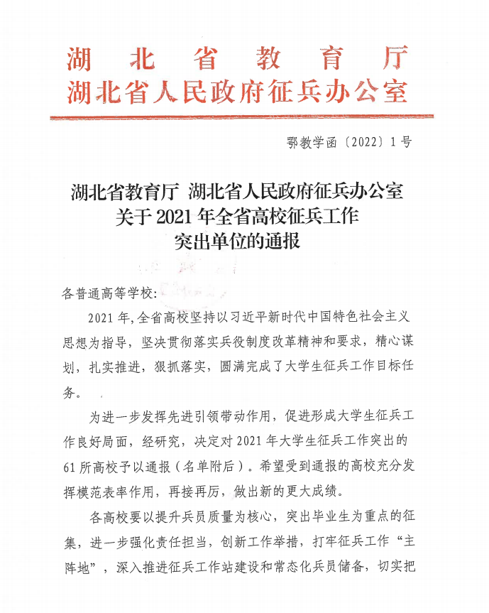 日前,湖北省教育厅和湖北省人民政府征兵办公室联合发文,对2021年全省高校征兵工作突出单位进行通报表彰,球探qiutan(中国)官方获评全省高校征兵工作突出单位。