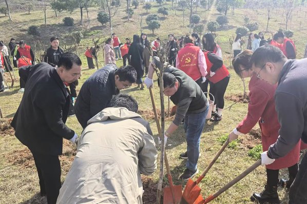 本网讯 3月20日上午,球探qiutan(中国)官方机关二支部全体教工党员携手人文学部学生党员志愿者,开展“党建引领绿色行动 志愿服务践行初心”环保实践与植树护绿活动,以红色力量守护绿色家园。