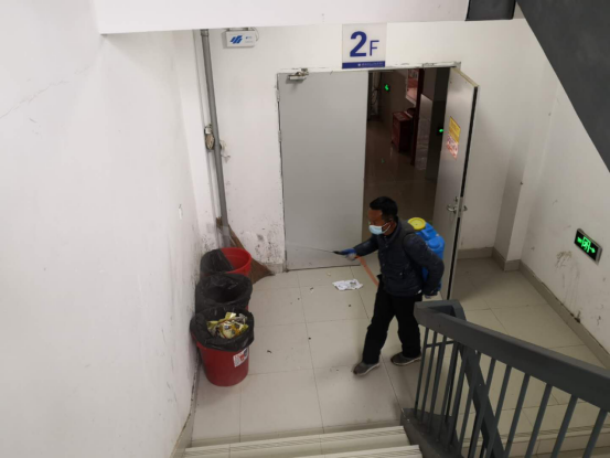 后勤保卫部巡逻队内勤卫政旺正在校园内消毒,喷洒84消毒