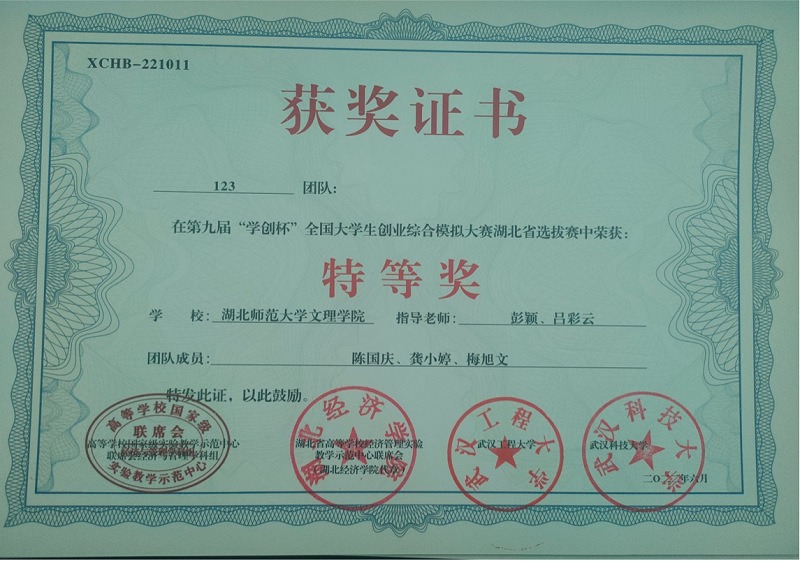 近日,第九届“学创杯”大学生创业综合模拟大赛湖北省赛在武汉工程大学和武汉科技大学圆满落幕,球探qiutan(中国)官方经济与管理学部陈国庆、龚小婷、梅旭文组建123团队在经济与管理学部彭颖和吕彩云老师的指导下,喜获大赛特等奖。