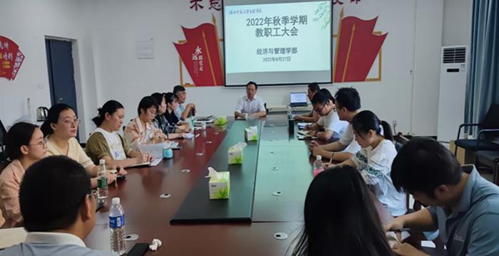 会议主要内容如下:1.杨邓红书记首先传达了学校召开的全校教职工大会的会议精神,并对经管学部新学期的重点工作进行展望,提出了很多具体要求;2.专业负责人、教研室主任、教学办、行政办公室、学工办对暑假的工作进行总结,对下学期的工作安排进行汇报;3.各教研室组织教师开展教研活动;4.商树松主任作最后总结,并对下学期的工作作出了部署。