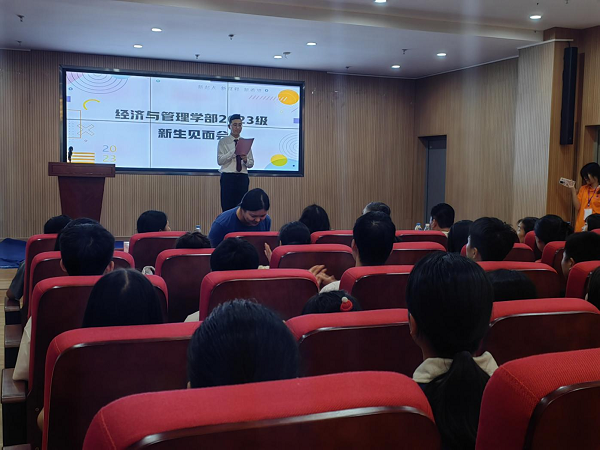 9月9日下午2点,经济与管理学部于图书馆报告厅召开了2023级新生见面会。参加此次活动的有学部主任商树松教授、党总支副书记罗铭、专业负责人葛子明、鲁千霞等16名学部教师以及285名新生,活动由学部团学主席张广林主持。