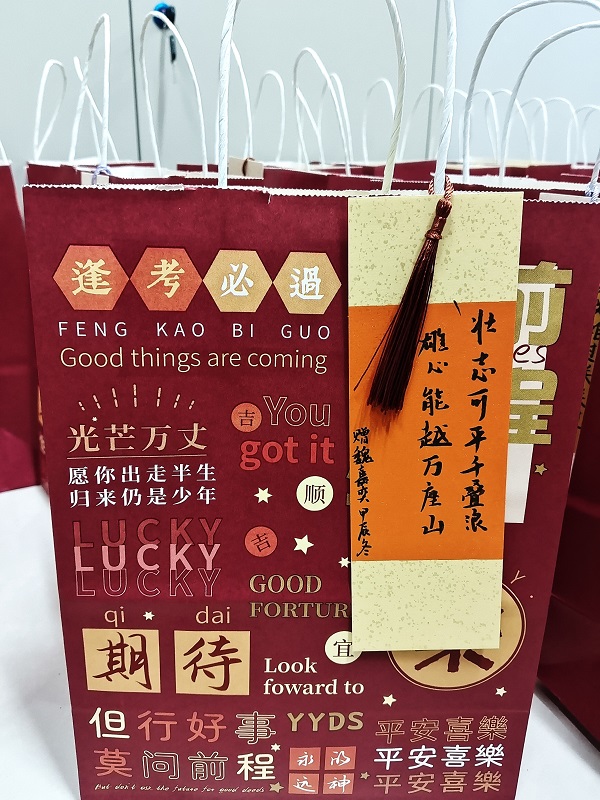 活动现场,学部精心策划,为每位考研学子准备了一份满载祝福的“考研暖心包”:橙子寓意心想事“橙”,一战“橙”硕;薯愿寓意“薯”你最棒,如你所“愿”;士力架寓意“巧克”难题,能量满满;签字笔则寓意“以笔为剑,乘风破浪”礼包上都张贴着老师们亲手书写的考研“祝福贴”,极大地彰显了学部的人文关怀。