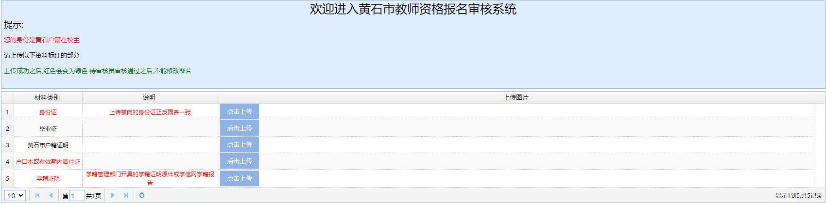 注意:请各位考生上传材料到黄石市教师资格报名审核系统后,务必返回在中国教育考试网(ntce.neea.edu.cn)中查看审核状态。如审核状态为“不通过”,请重新提交报考信息,等待审核。否则审核系统中因看不到相关报考信息,无法审核。