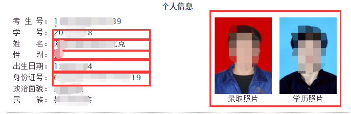 三、自查内容:考生号、学号、入学日期、预计毕业日期(2024.06.30)、专业(如有转专业情况显示专业信息为现所读专业,转专业学生班级、学部信息如未改变可忽略)、姓名、性别、出生日期、身份证号、照片(红色为重点检查内容,尤其是学历照片,如有未睁眼、歪斜等情况及时联系)。