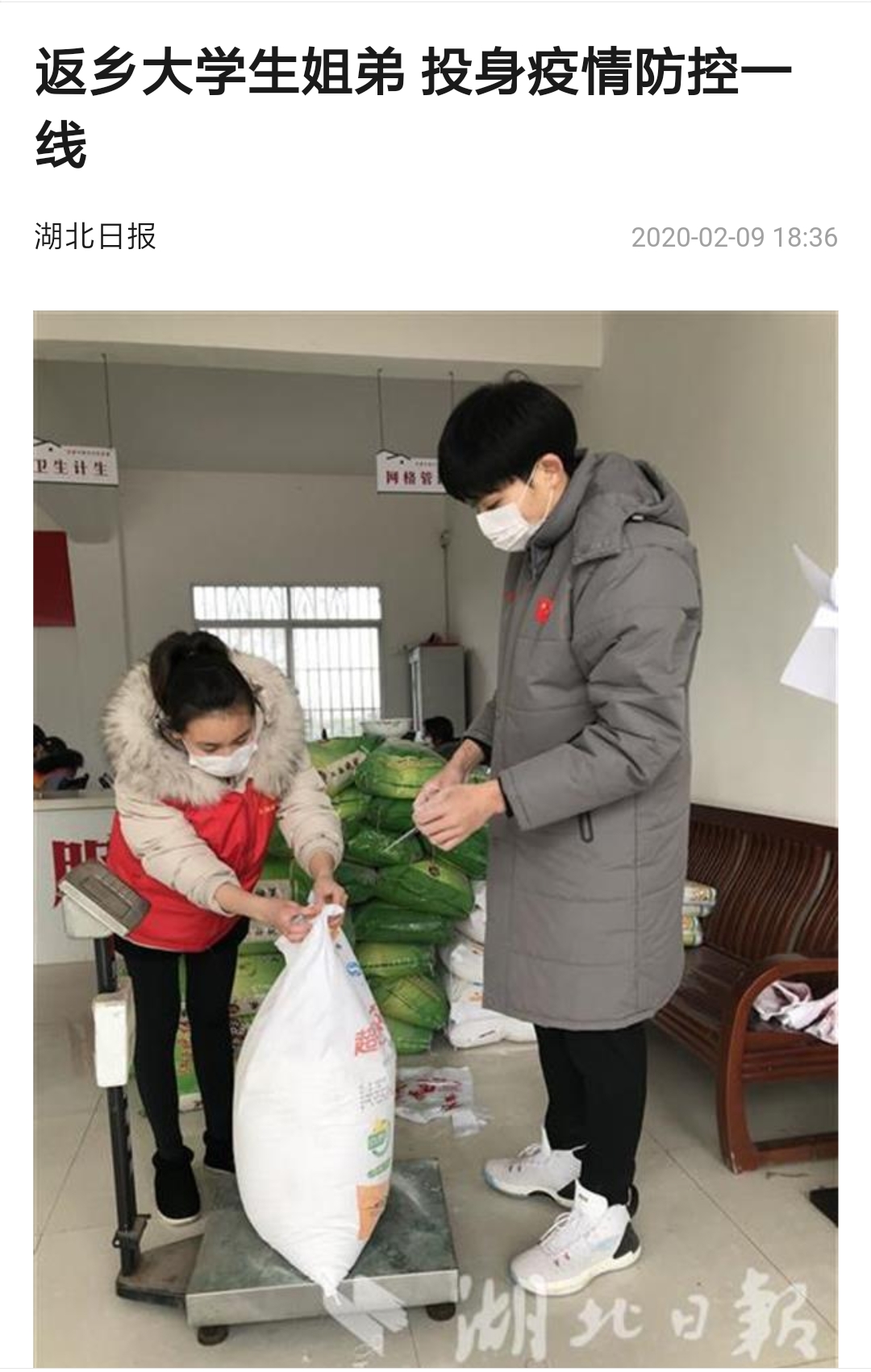 2020年2月9日,湖北日报上有一篇关于疫情防控的新闻引起广泛关注,主人翁正是球探网页版理工学部数学与应用数学专业1603班的吕奎同学和其弟弟吕东阳。据报道,2020年2月7日,姐弟俩从村微信群里看到“志愿者征集令”后,2月8日一大早便到三州村委会报到,参与对村民生活必需品的分装与发放。图片中是2月8日当天,他们在枝江市百里洲镇三洲村防疫物资分配现场填写订购物资的订购居民的姓名并给居民分配物资时的情景。姐弟俩一个牵着口袋,一个则对袋中面粉进行分装。分装完面粉后,又开始为居家隔离的村民分装集中采购的大米、面条和新鲜的蔬菜并贴上标签,以备村组干部精准送达村民家中。