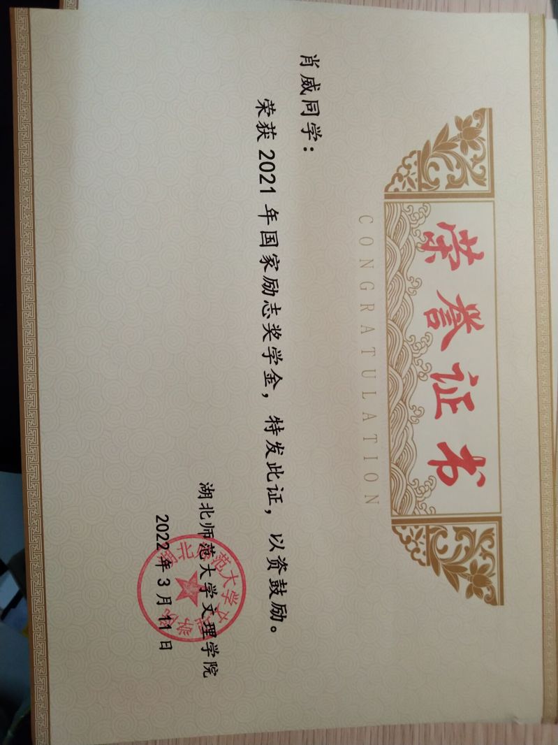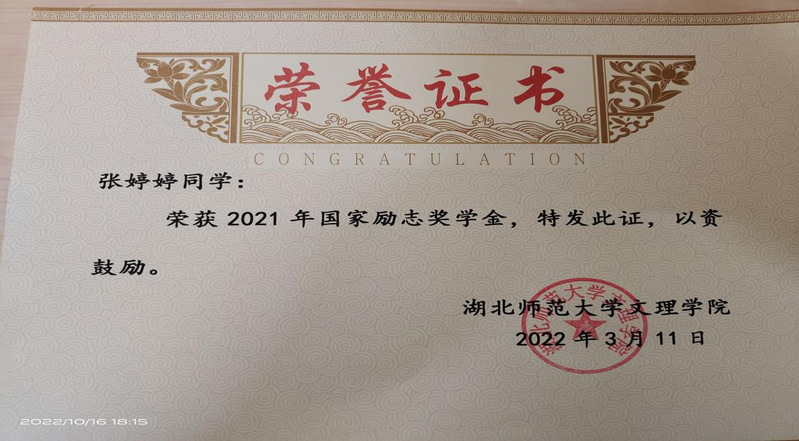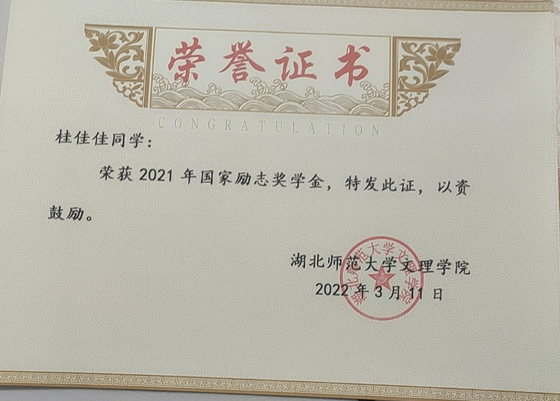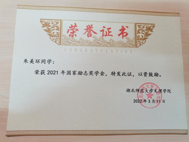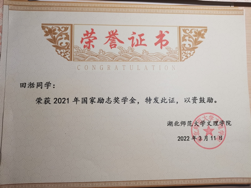 田湉等6名同学荣获2021年国家励志奖学金