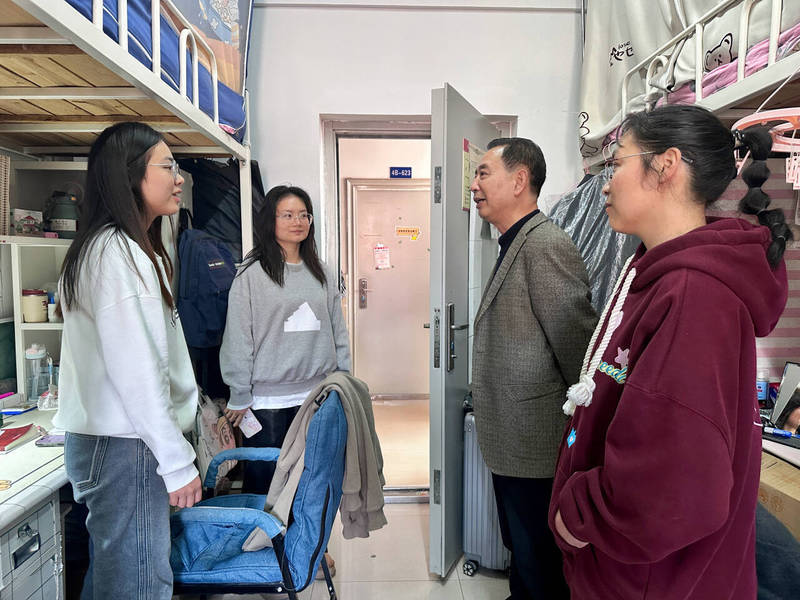 周景斌书记强调宿舍是学生学习、生活的重要场所,也是思想政治教育以及安全管理工作的重要场所。他与同学们进行了亲切的交流,鼓励同学们努力学习,认真大胆考研;加强身体锻炼,注意安全,提高反诈意识,遵守校纪校规;室友之间要团结友爱,互帮互助。