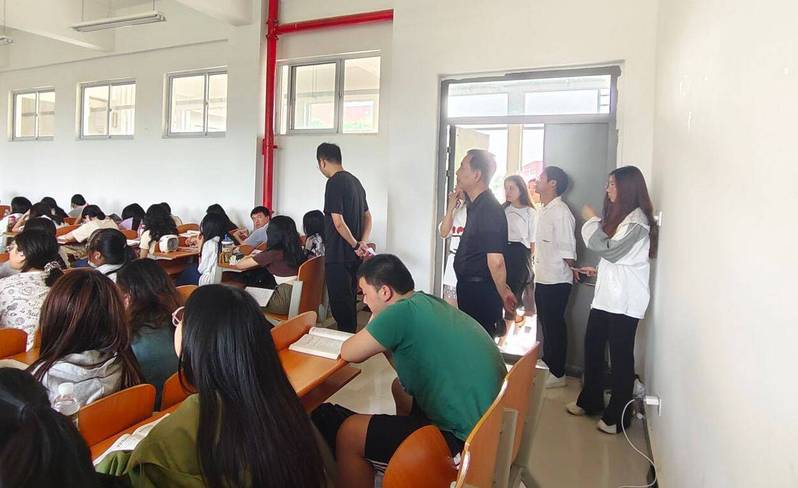 6710时,在人文学部周景斌书记的带队下,辅导员老师郭旭林、胡文玉、高悦、李礼、丁书嫚、黄安琪、程胜伟、杨峰进班参与日常查课,严抓上课纪律,引导学生手机入袋。针对部分学生上课注意力不集中、分心、玩手机等行为进行批评教育,督促人文学子养成良好学风。期末在即,周景斌书记强调:“教学相辅,专任教师也要对学生进行纪律教育,认真备考,检验自己一学期的学习成果,对自己负责。”与此同时,还对任课老师的责任心、教学态度、教学水平提出更高要求,力求形成专任教师与辅导员之间的育人合力。