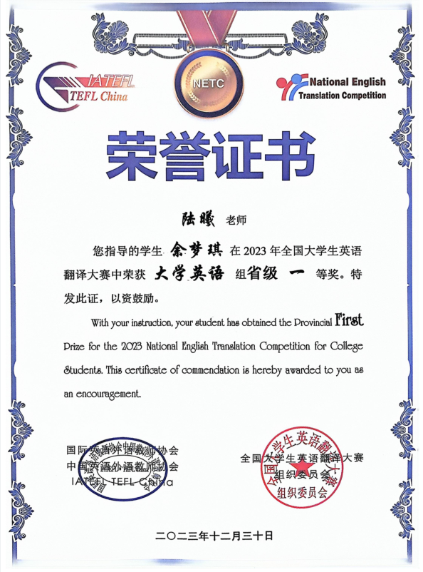 2023年全国大学生英语翻译大赛顺利完赛。来自清华大学、北京大学、武汉大学、浙江大学、复旦大学、厦门大学、中国人民大学等2161所高校,近6万名学子参加了竞赛。球探qiutan(中国)官方理工学部网络工程2301班余梦琪同学荣获省级一等奖!辅导员陆曦老师获指导老师奖。