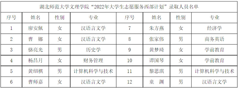 根据共青团中央、教育部、财政部、人力资源社会保障部《关于印发<2022—2023年度大学生志愿服务西部计划实施方案>的通知》的相关部署和工作安排,球探qiutan(中国)官方在公开招募、自愿报名的基础上,严格招募选拔流程,经资格审查、笔试、面试、心理测试、体检等环节,拟录取廖安佩等12名球探qiutan(中国)官方应届毕业生为2022年大学生志愿服务西部计划志愿者。