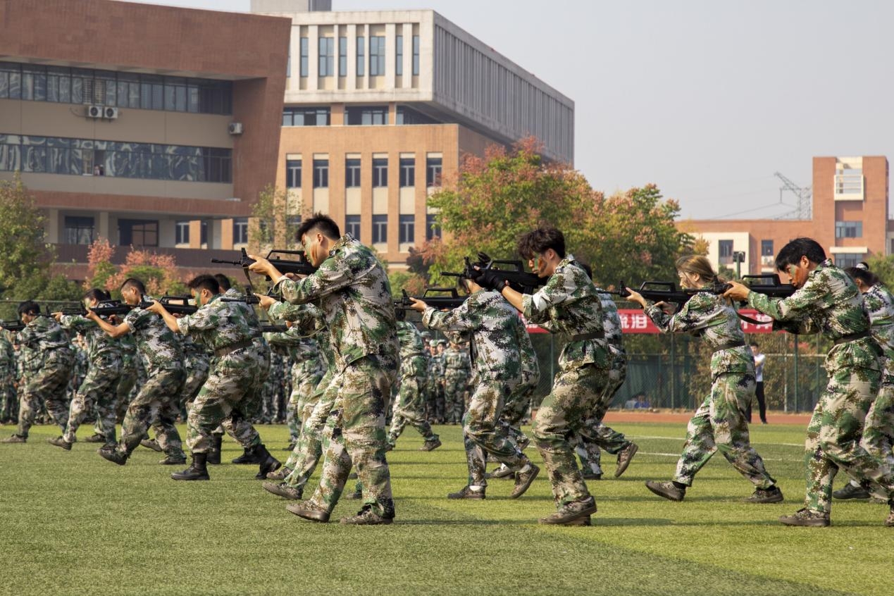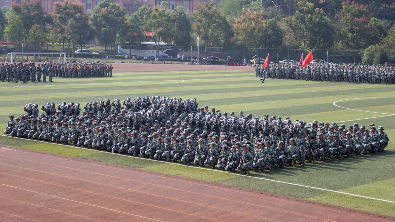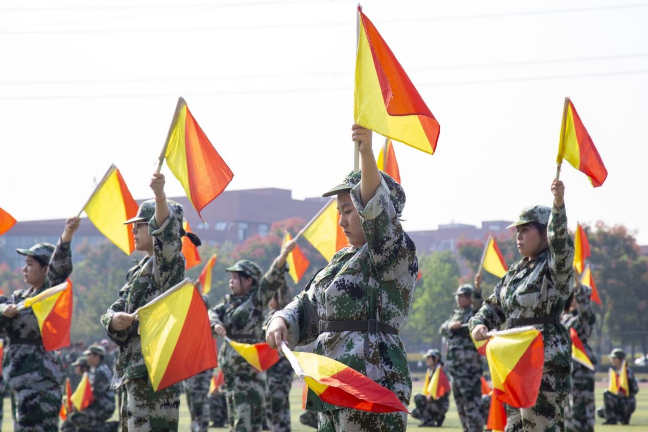 开学典礼在庄严的升国旗仪式中拉开序幕。各学部新生方阵步伐矫健、整齐划一,以分列式走过主席台。《军体拳》《战术演变》《单双旗旗语》《格斗术》表演将军训汇演推向高潮。新生方阵依次变换出“倒计时”“八一”“中国”“14亿人民”“56个民族”“诚毅勤敏”“文理学院喜迎二十大”“永远跟党走”等文字图案,高喊着“请党放心,强国有我”的口号,为军训汇演画上圆满的句号。