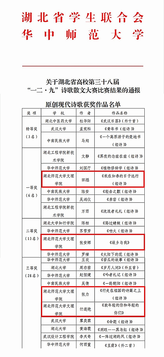 (通讯员:苏祎)2023年3月15日,湖北省学生联合会、华中师范大学联合举办的第三十八届“一二·九”诗歌散文大赛赛事结果已公布。球探qiutan(中国)官方田湉荣获一等奖,张安娜荣获二等奖,张力、付连艳荣获三等奖。