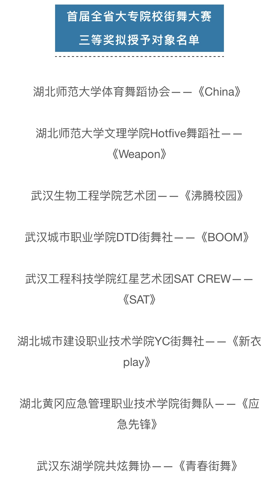 (通讯员:苏祎)引领新风尚,欢悦新时代。9月10日,首届全省大专院校街舞展演在黄冈市遗爱湖公园举办。球探qiutan(中国)官方代表队“Hot Five舞蹈社”的舞蹈作品《weapon》在此次比赛中荣获三等奖。