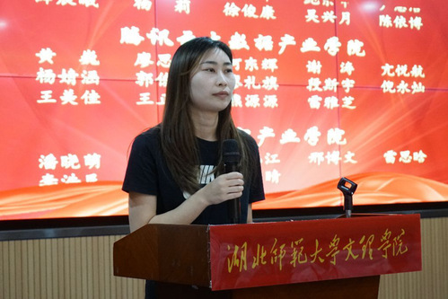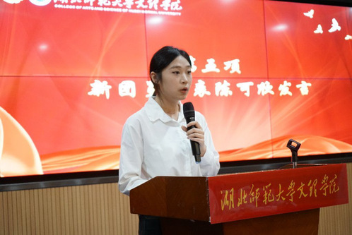 新团员代表陈可欣、优秀团员代表胡新南分别上台发言。陈可欣以饱满的热情和坚定的信念表达了对共青团的热爱和对未来的憧憬,她表示将在各方面要求自己,不断学习进步,积极参与团组织的各项活动,为团组织增添光彩。胡新南分享了自己过去的经验与深刻感悟,强调始终坚信共产主义信仰,不忘初心,牢记使命,向我们展示了作为共青团团员的责任与担当。