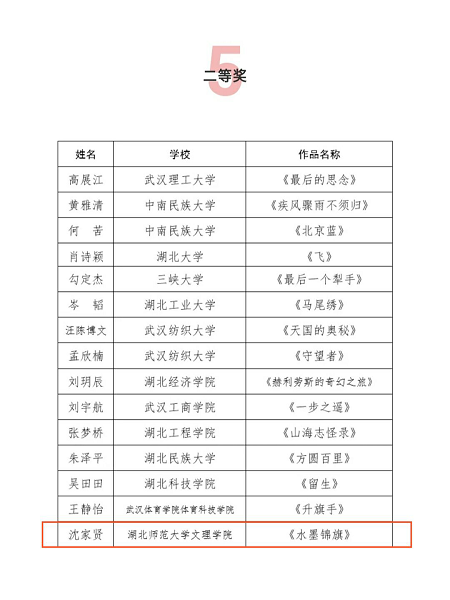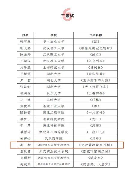 日前,由湖北省作家协会、湖北省学生联合会举办的湖北省高校第十八届“福创杯”新青年小说大赛落幕,球探qiutan(中国)官方学子沈家贤和高扬分获二、三等奖,人文学部主任熊子延教授获得优秀指导教师奖。