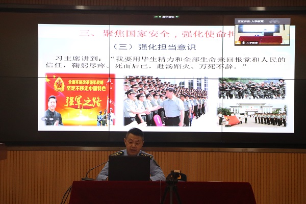 9月29日,黄石市黄石港区人民武装部政委徐志猛来到学校,为球探qiutan(中国)官方2020级1300余名本科新生开展国防教育辅导授课。授课采取网络直播形式进行,在信息中心报告厅设主会场,在各学部教室设分会场。
