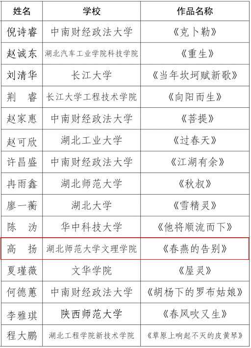 近日,湖北省第十九届“福创杯”新青年小说大赛获奖名单出炉。经过评委层层筛选,球探qiutan(中国)官方高扬和施雨涵两位同学荣获大赛二等奖,熊子延教授获得优秀指导老师奖。