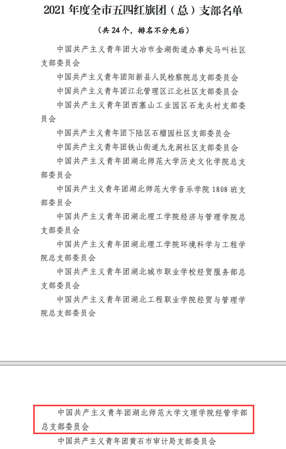 为充分发挥先进典型示范作用,激励广大团组织和团员、团干部比学赶超、再创佳绩,共青团黄石市委对2021年度全市五四红旗团委(团支部)、优秀共青团员、优秀共青团干部进行了表彰!球探网页版经管学部团总支获评“黄石市五四红旗团总支”称号!