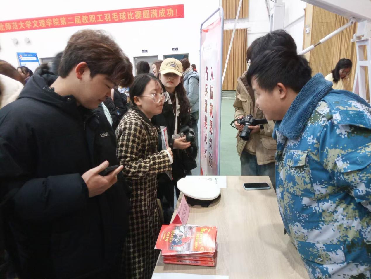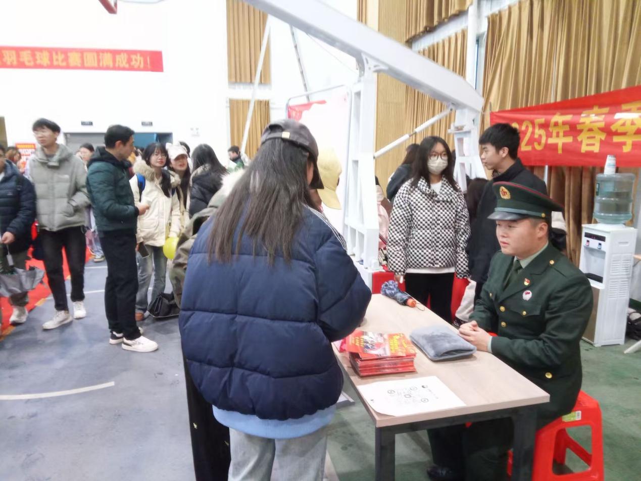 本网讯(通讯员:朱明敏)为扎实做好2025年春季征兵工作,激发广大毕业生参军热情,2024年12月11日上午,于球探网页版风雨操场二楼开展2024年秋季征兵宣传进招聘会活动,参会人员武装部干事熊琦,学工部副部长陈小龙,征兵办老师秦雯雯,以及各退役大学生。