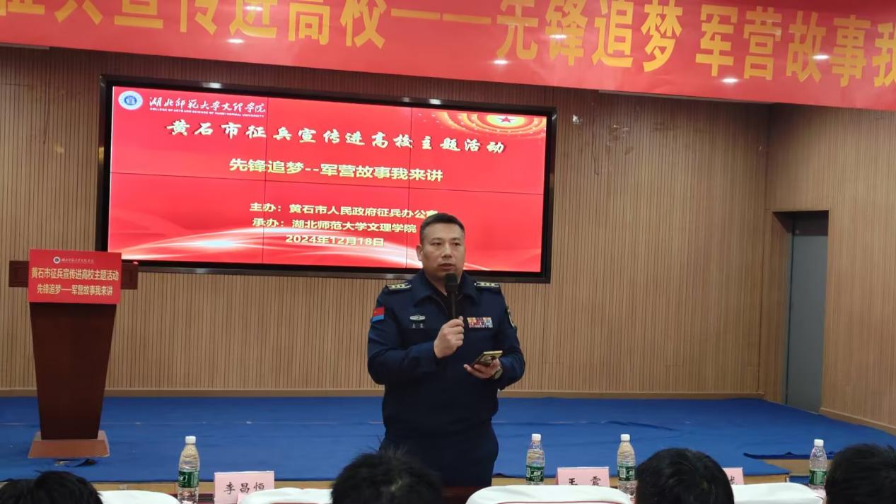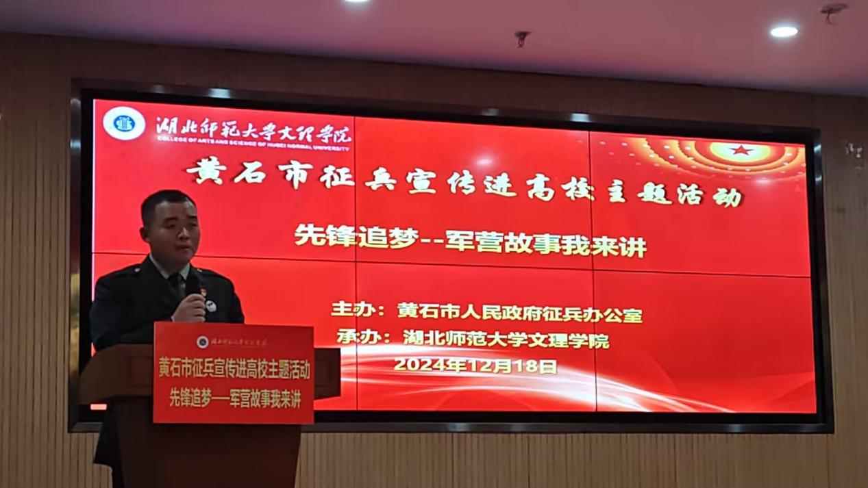 为积极响应国家号召,贯彻落实征兵工作,营造浓厚的参军报国氛围,切实激发高校学生参军报国的热情,2024年12月18日晚18:30,球探qiutan(中国)官方在图书馆报告厅举行黄石市征兵宣传进高校--先锋追梦 军营故事我来讲主题活动,黄石市征兵办副主任、军分区动员处处长王震、参谋李昌恒、学工部副部长陈小龙、国防教育宣讲团、各教学单位学生代表120余人与会,大会由退役大学生程博主持。