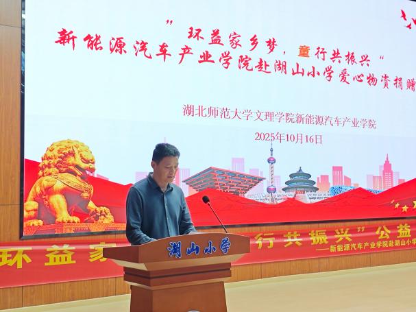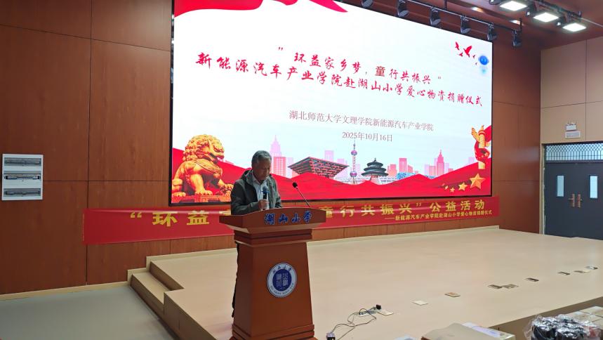 10月16日的落幕仪式上,暖意融融。球探网页版新能源汽车产业学院院长许新山、党支部副书记费凡、团学指导老师石卉、学工主任谭姣、教学主任邢凯,以及湖山小学教联体书记吴风照、校长张柄运等嘉宾出席,共同见证这份爱心的传递。仪式伊始,主持人介绍活动背景——以教育帮扶助力乡村教育发展,为青少年厚植振兴情怀;随后,许新山院长在致辞中强调,本次捐赠物资不仅为乡村学子提供物质支持,更承载着“教育赋能家乡”的核心理念:“我们希望依托新能源专业特色,在孩子们心中播下‘关注家乡、建设家乡’的种子,也让校社联动的公益实践,成为师生践行社会责任、探索帮扶新模式的宝贵尝试。”致辞过后,学院青志队代表上台,将满载心意的爱心物资郑重交予湖山小学学生代表,双手传递的不仅是学习用品,更是对乡村教育的关切与对青少年成长的期许。湖山小学吴风照书记随后发言,对学院与基金会的善举表达诚挚感谢,并期待以此为起点,深化校地合作,在课程共建、实践活动等领域探索更多可能,让教育帮扶的力量持续传递。