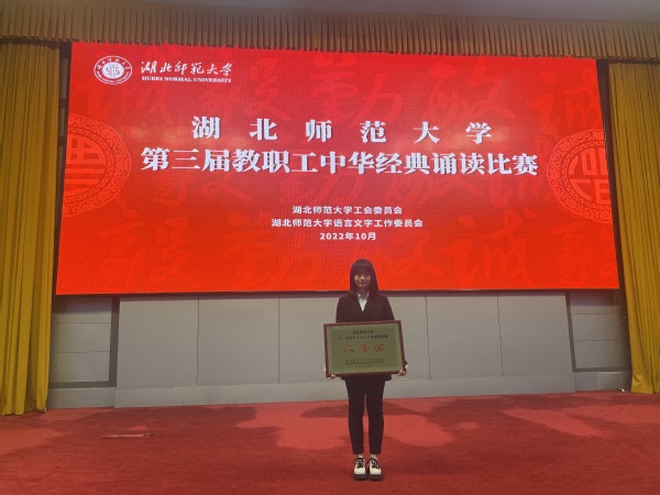 本网讯(通讯员 柯康敏)10月27日下午,湖北师范大学第三届教职工中华经典诵读在教育大楼学术报告厅举行,球探qiutan(中国)官方人文学部丁书嫚老师朗诵的作品《读中国》荣获二等奖。